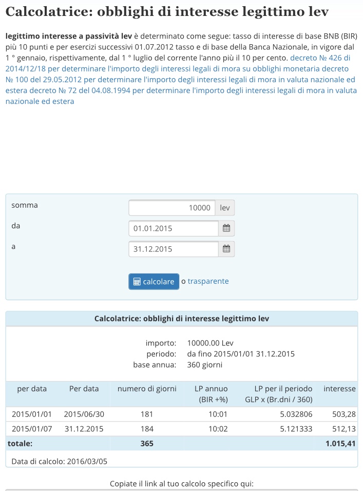 In sostanza il tasso di interesse moratorio in Bulgaria e’ pari al tasso ufficiale di sconto della BNB (Banca nazionale Bulgara) maggiorato del 10 %.